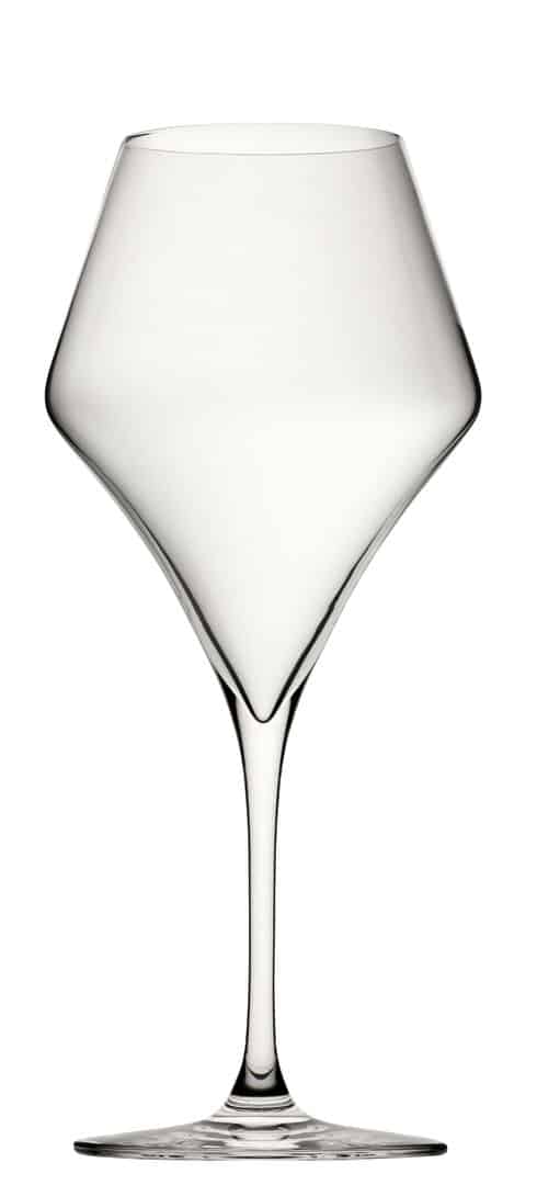 Crystal red wine glasses, A dramatic silhouette featuring an angular bowl which descends into a slender drawn stem. The Aram Collection features diamond shaped bowls with elegant pulled stems and laser-treated rims for improved resistance against chipping and breakage.