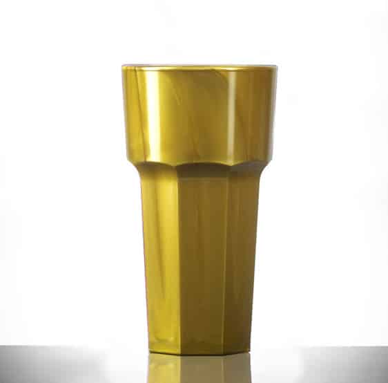 Introducing the Elite Remedy 12oz Tall Gold – Case of 36. These exceptional glasses are manufactured in the UK from virtually unbreakable polycarbonate and feature an elegant gold finish. Each glass boasts a 340ml (12oz) capacity, with dimensions carefully considered for the perfect pour: a 79mm top width, 51mm bottom width, and a height of 144mm. Weighing a mere 136g, they offer a comfortable hold and are glass washer safe for up to 500 cycles. Furthermore, they are fully reusable and recyclable, aligning with your commitment to environmental responsibility.