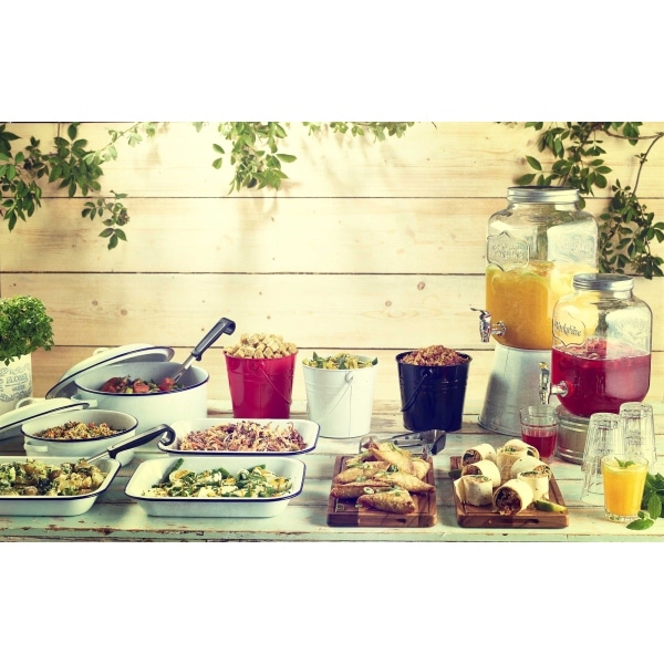 •Classic white and blue enamel finish provides a stylish and retro addition to food and table presentation