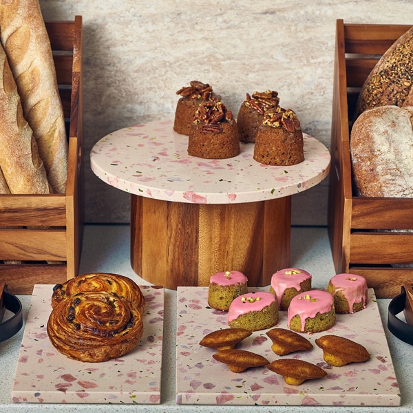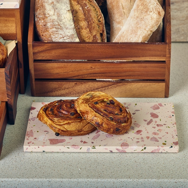 GenWare Terrazzo Platters are a multifunctional product used for buffets, coffee shop displays or tabletop food presentation. The platters are made of terrazzo, a composite material consisting of cement and small marble chips in a variety of colours resulting in individual characteristics across every piece. Terrazzo is a durable and pleasingly vibrant material that will bring a touch of colour to food presentation.