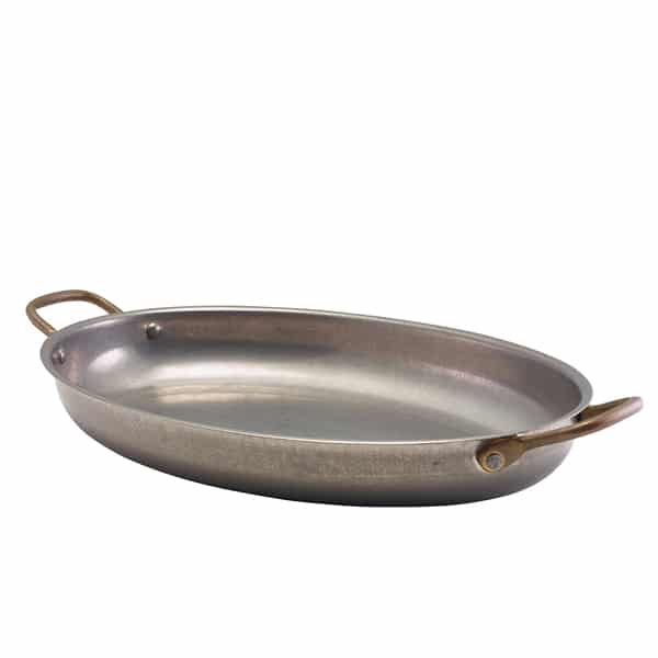 The Vintage Steel collection creates an industrial look to food presentation perfectly suited to a wide range of popular cuisines. The range is made from stainless steel with an industrial vintage finish safe for direct food contact. The oval dishes feature attractive brass handles well suited to upscale casual dining.