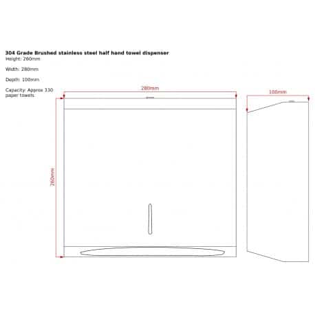 This Half Hand Towel Dispenser boasts a generous capacity of approximately 330 paper towels, minimising the need for frequent refills. Measuring 260mm in height, 280mm in width, and 100mm in depth, it offers a compact yet practical solution for various washroom settings. The brushed stainless steel finish resists fingerprints and smudges, maintaining a clean and professional appearance.