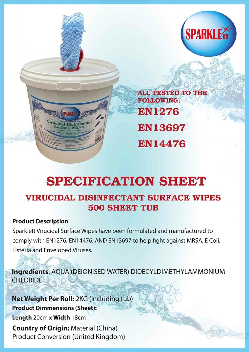Introducing our Tub of 500 Virucidal Disinfectant Surface Wipes. These wipes are packaged in a large, commercial dispenser tub containing 500 individual cloth wipes, each measuring 20 x 18cm. Perfect for disinfecting all types of surfaces, including high-touch points such as tabletops, furniture, handles, equipment, machinery, computers, and desks. Formulated and tested to comply with EN1276, EN14476, and EN13697 standards, these wipes protect against MRSA, E-Coli, Listeria, and enveloped viruses. Manufactured in the United Kingdom, the airtight plastic tub features an opening in the lid for easy dispensing. Net weight of bucket: 2kg. Ingredients: De-ionised water, Didecyldimethylammonium Chloride.