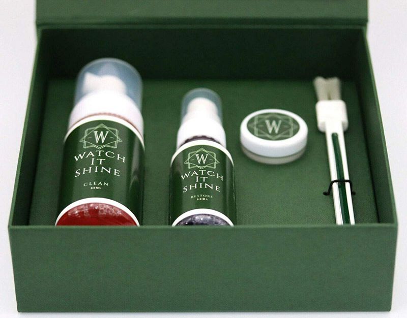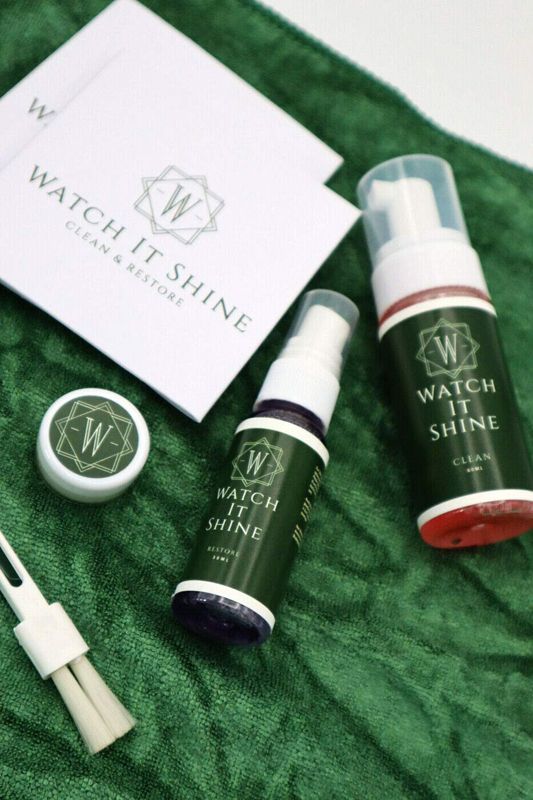 - Kit Includes: 1 x Restore Cleaning – Foam pump – 60 ml to clear of dirt and grit, 1 x Shine cleaning – 30ml bring your metals up to a shine, 2 x polishing clothes,1 x brush to help clean inside your watch, 1 x microfibre cloth to use as base to clean on – all placed inside a luxy gift box.